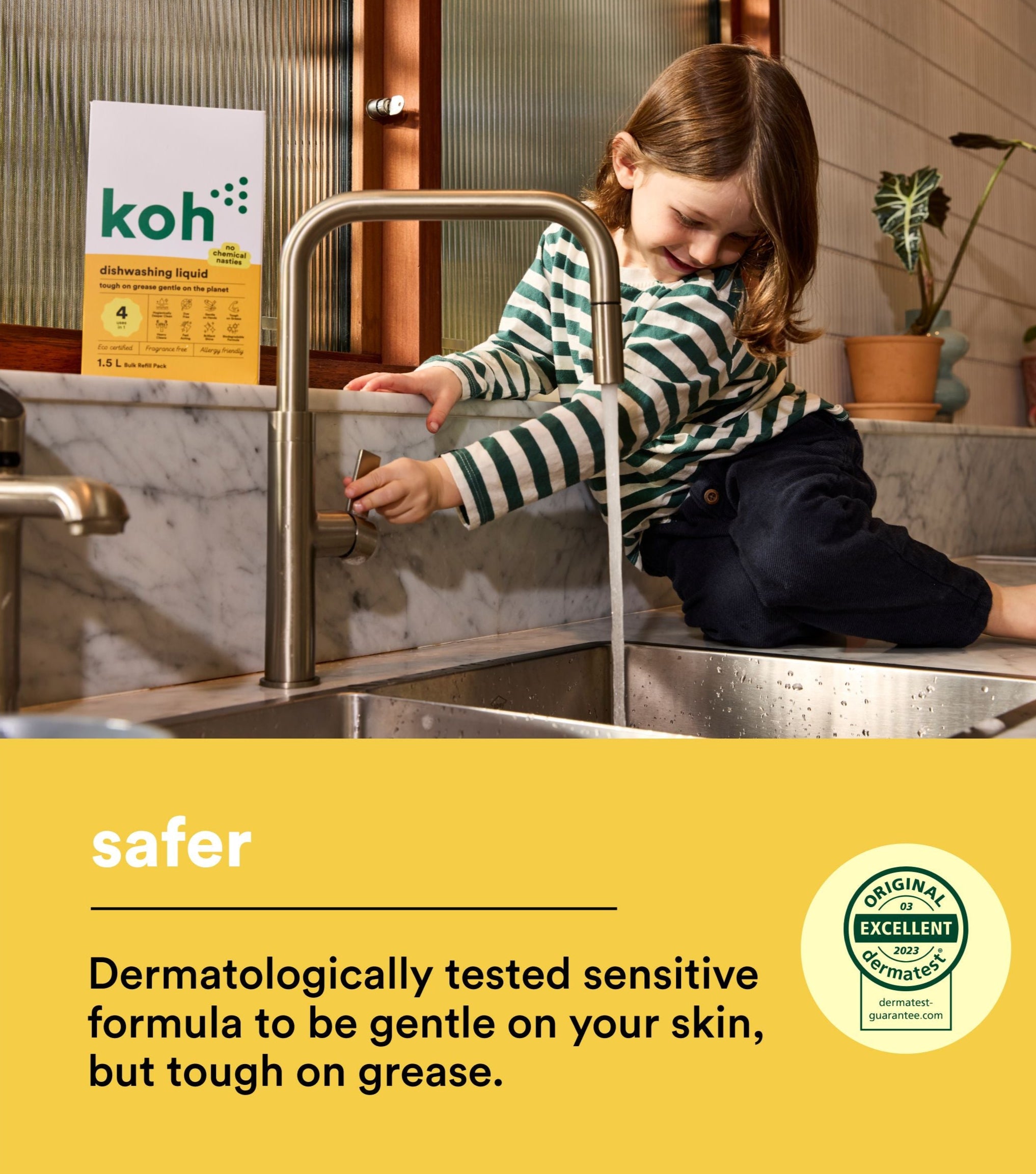 Formulated without the synthetic colours, fragrances and unnecessary chemical nasties found in other products. Koh Dishwashing Liquid uses biodegradable enzymes to give you a powerful clean without the nasties.
