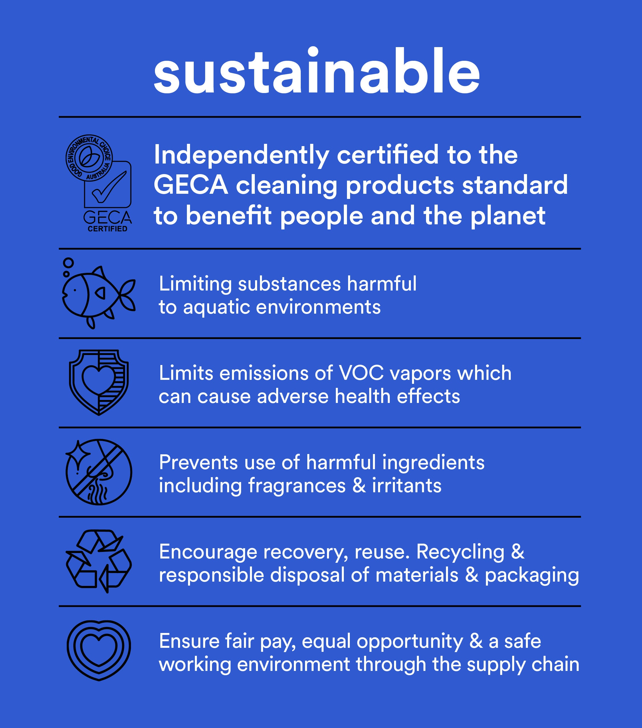 Independently certified by GECA (Good Environmental Choice Australia) to be safe on the environment and human health.