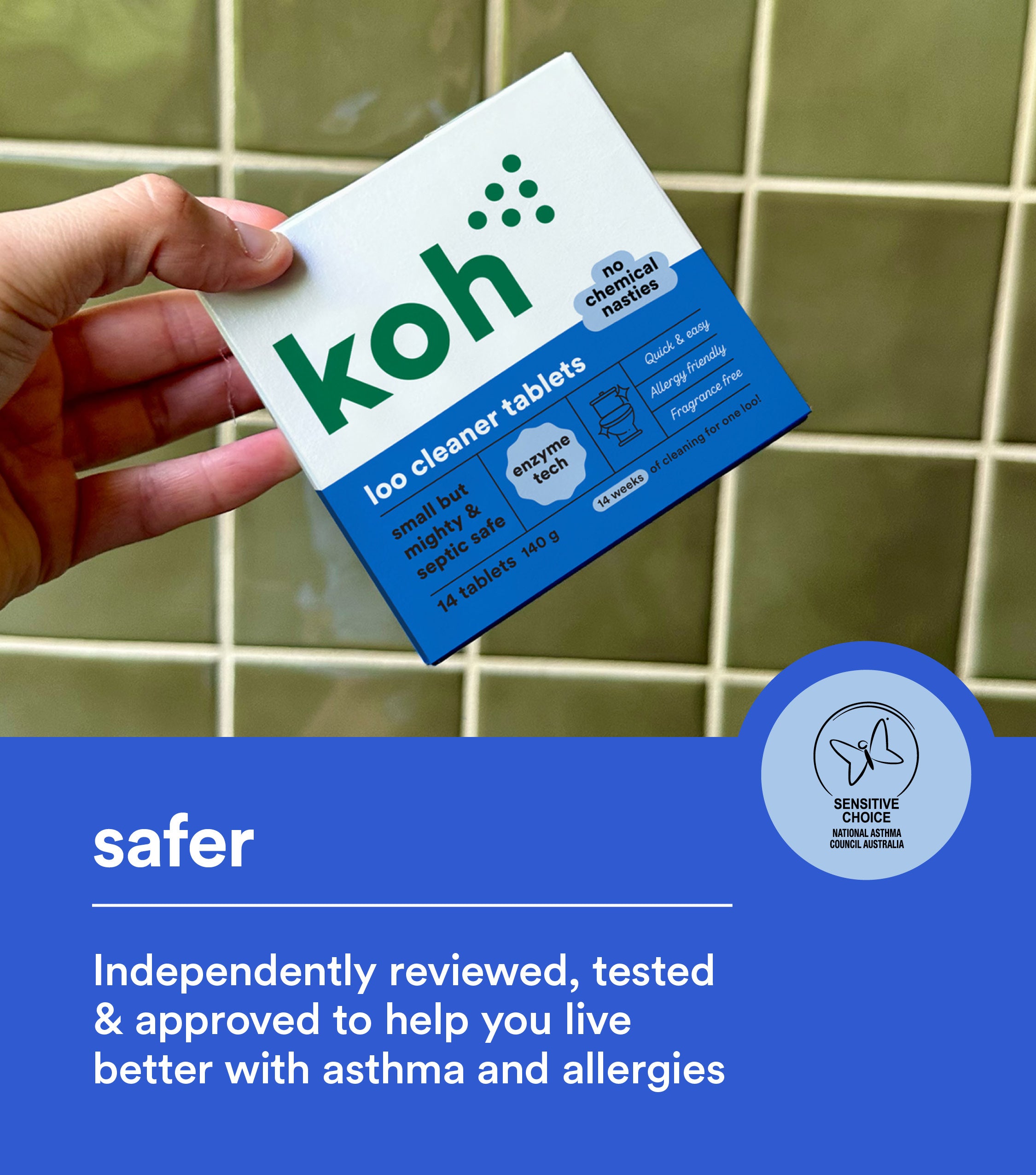 A cleaner home doesn’t need to come at the sacrifice of a good, clean planet. Our Koh Loo Tabs are GECA-Certified and Sensitive Choice approved, meaning your porcelain throne can be sparkling clean and good for you, your family and the planet.