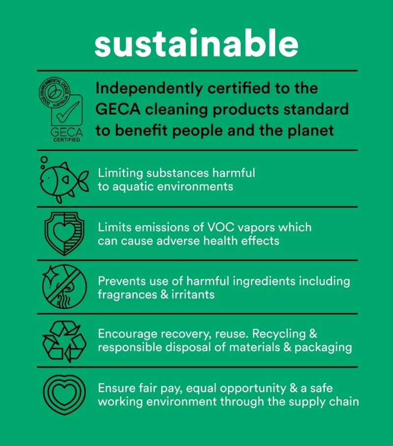 Koh Universal Cleaner is eco-certified by GECA, Australia’s only independent, not-for-profit sustainability and environmental certification as a good environmental choice.