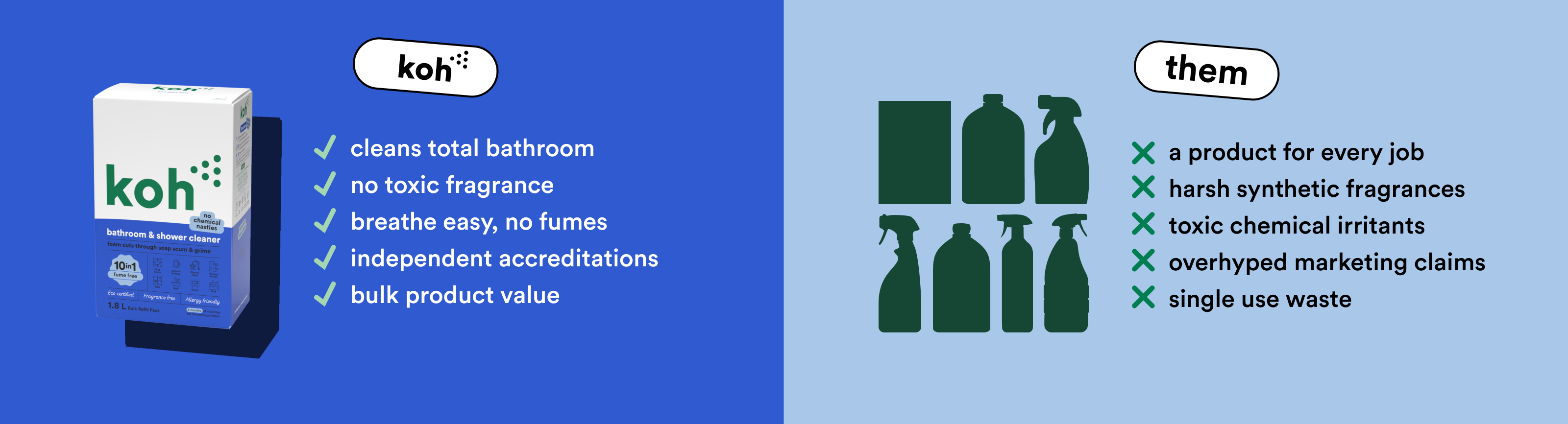 The cleaning industry has long leaned on hardcore chemicals delivered with plenty of elbow grease. At Koh, we believe in less leaning, and more cleaning. That’s why we’ve doubled down on innovation, to develop our own (scientifically tested) products, delivered with tools that make your clean a dream. From atomisers that use less, to loo blades that swipe more, we’ll never stop working hard to make your clean easy.