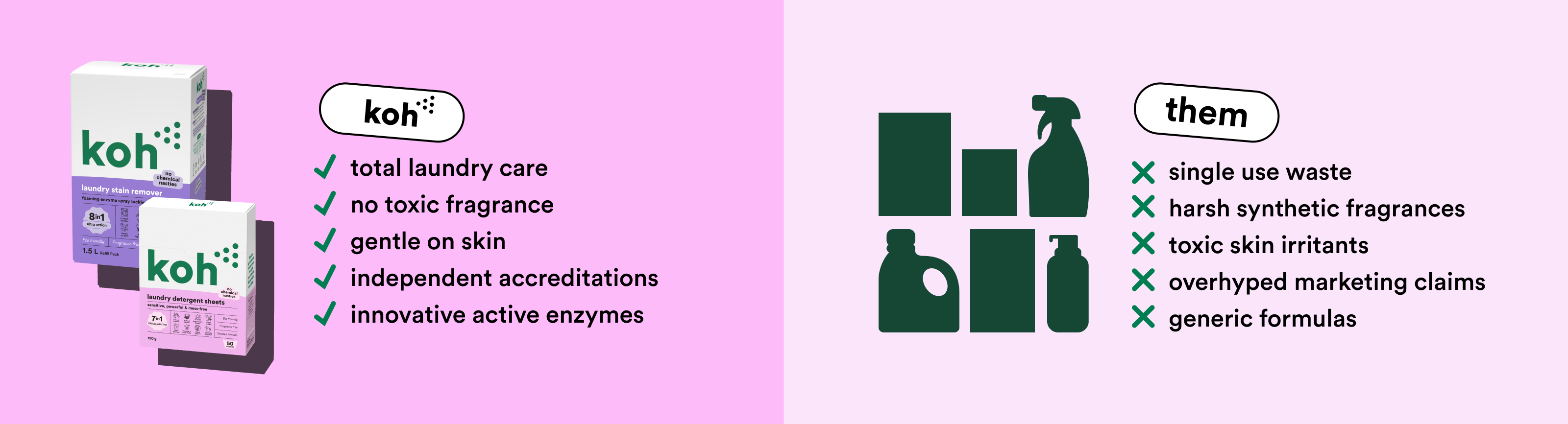 Like it or not, ‘green’ products don’t always have the best reputation. Organic ingredients are friendly on the skin, but sometimes a little too friendly on grime. Koh ticks both boxes: our formulas tackle mess instantly, without stripping your skin or making you wheeze. Bathroom, kitchen, or crayon on the wall; Koh cleans it all — fast.