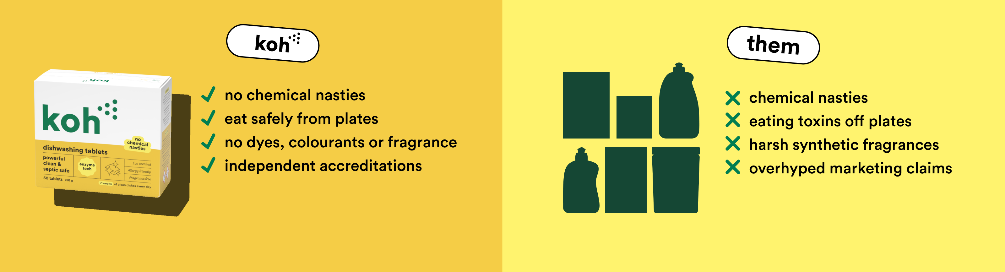 Like it or not, ‘green’ products don’t always have the best reputation. Organic ingredients are friendly on the skin, but sometimes a little too friendly on grime. Koh ticks both boxes: our formulas tackle mess instantly, without stripping your skin or making you wheeze. Bathroom, kitchen, or crayon on the wall; Koh cleans it all — fast.