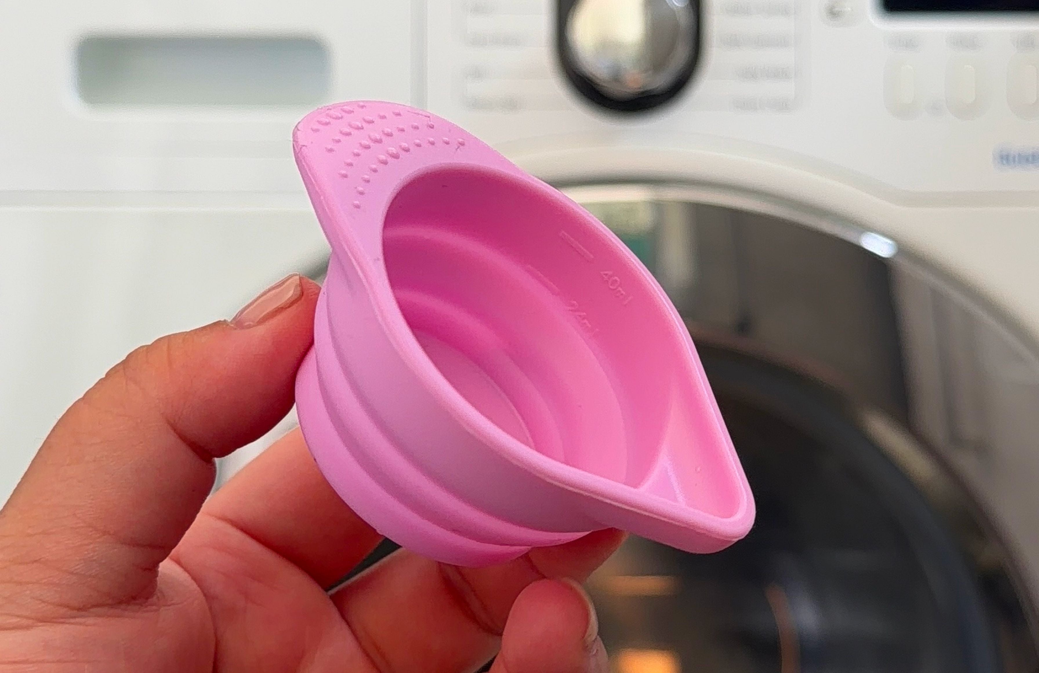 A toss-in dosing cup with clear markers to stop overpouring and reduce mess.