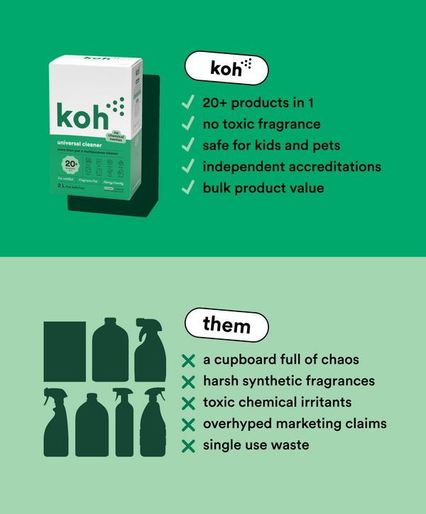 Like it or not, ‘green’ products don’t always have the best reputation. Organic ingredients are friendly on the skin, but sometimes a little too friendly on grime. Koh ticks both boxes: our formulas tackle mess instantly, without stripping your skin or making you wheeze. Bathroom, kitchen, or crayon on the wall; Koh cleans it all — fast.