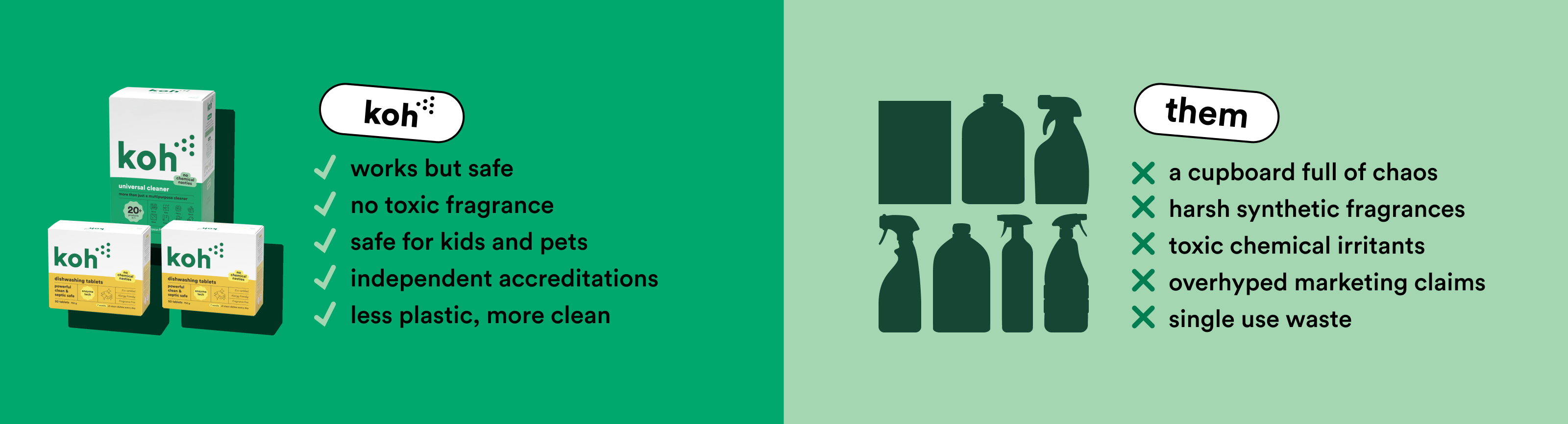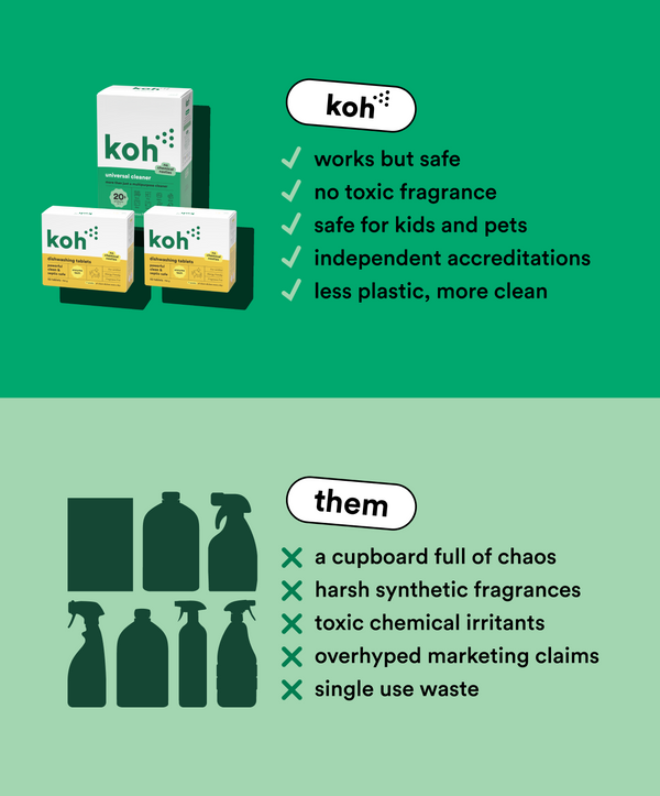 Like it or not, ‘green’ products don’t always have the best reputation. Organic ingredients are friendly on the skin, but sometimes a little too friendly on grime. Koh ticks both boxes: our formulas tackle mess instantly, without stripping your skin or making you wheeze. Bathroom, kitchen, or crayon on the wall; Koh cleans it all — fast.